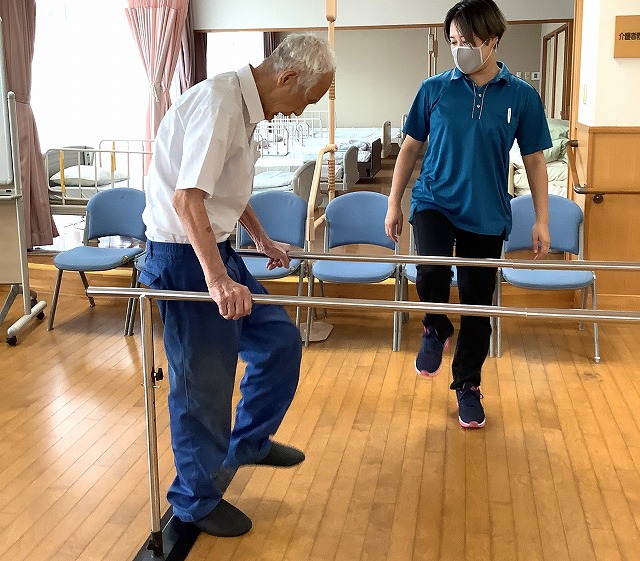 こちらは平行棒で機能訓練をしています。無理せず、コツコツと。 ”良く維持してる! 動きがよくなってる!” スタッフは心の中でいつも応援していますよ!!